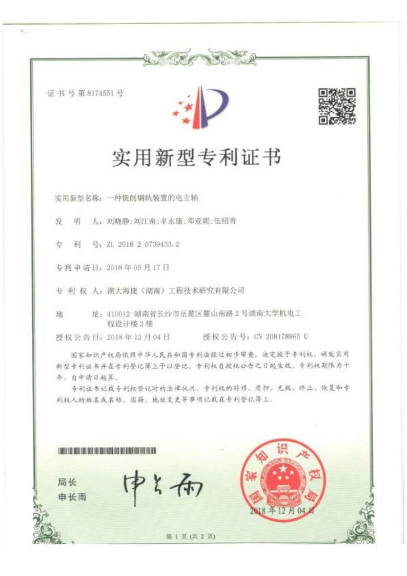 一种铣削钢轨装置的电主轴